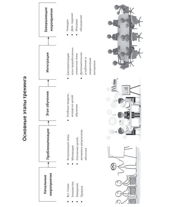 На предыдущей странице расположена структура, включающая основные этапы обучающих тренингов. Именно эта структура лежит в основе технологии проведения тренинга, которая излагается в данной книге, и является ее ключевым элементом. Она универсальна и позволяет разрабатывать и проводить любые обучающие тренинги.