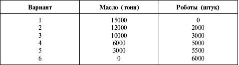 Будем исходить из того, что если все население страны станет производить масло, то оно получит 15 000 тонн. Если же – роботы, то будет выпущено 6000 штук. Конечно, роботы и масло могут производиться и одновременно.