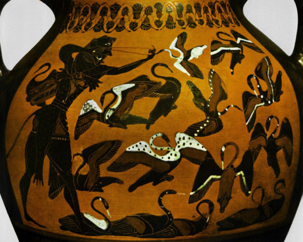 Так продолжалось до тех пор, пока наши путешественники не увидели вдали странный большой остров. С острова стали взлететь в воздух одна за другой большие птицы в сверкающем оперении. Пролетая над кораблем, птицы роняли свои блестящие перья, которое оказались сделанными из меди и бронзы. Перья, подобно стрелам, вонзались в незащищенные части тела гребцов, нанося им нешуточные раны. Аргонавты поняли, что достигли легендарного острова Аретиада, а птицы, с которыми они столкнулись – известные мифические стимфалиды, – птицы бога войны Ареса, которые поражают проплывающих мимо путешественников своими перьями – стрелами.