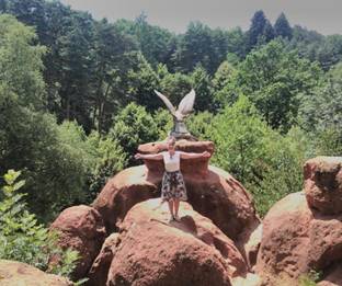 В Долине роз больше всего запоминается сорт «Двойное удовольствие» и «Мишка», хотя все они необыкновенны и ароматны! Когда-то в Болгарии я имела счастье побывать в подобном розарии. На огромного крокодила из камней забираюсь, подобрав ноги на всякий пожарный, подальше от зубастой пасти. Чего только не сделаешь ради удачного снимка!