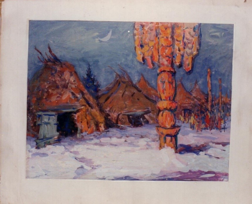 на Восток, покоряя Сибирь и Русскую Америку (Аляску и кусок земли в Калифорнии). Индейцы в этих местах жили в огороженных частоколом поселениях, в каждом из которых был свой тотем. Русский купец, промышленник, мореплаватеь, Григорий Шелехов отправился осваивать эти земли и организовал Российско-Американскую торговую компанию, т.к. они были богаты мехом и золотом. В одном из поселений был тотем ворон, поэтому и книга называется «Юконский ворон». Мой отчим защищал дипломный проект по этой книге. Дома была большая папка с 17-ю листами, написанных гуашью и темперой. Мой муж оформил эти работы под стекло. Художественный салон находился на Украинском бульваре. И все «Воспоминания о Родине» ушли через его диллера, остались – про Аляску. Эти освоенные русскими мануфактурщиками земли назвали Русская Америка. Но она просуществовала не долго, и в 1867 император Александр II продал Аляску Америке, из-за истории с Турцией.