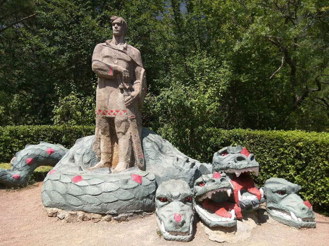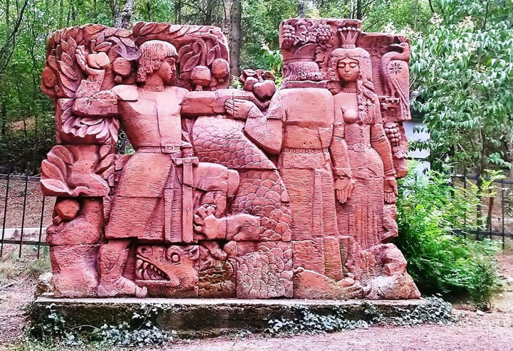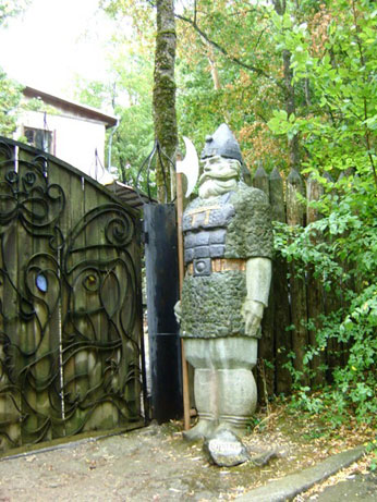Рядом появилась избушка Бабы Яги, весело зашагали по полянке дружные Боб, Лапоть и Соломинка. Огромная голова Великана охраняла этот сказочный мир, где могучий Тарас Бульба, Коварный Черномор и веселый Буратино как бы ожили под руками талантливого мастера, эти скульптуры были наивны, они вызывали ассоциации с народным творчеством, лубочными картинками, но в них было много тепла, искренности и доброго юмора.