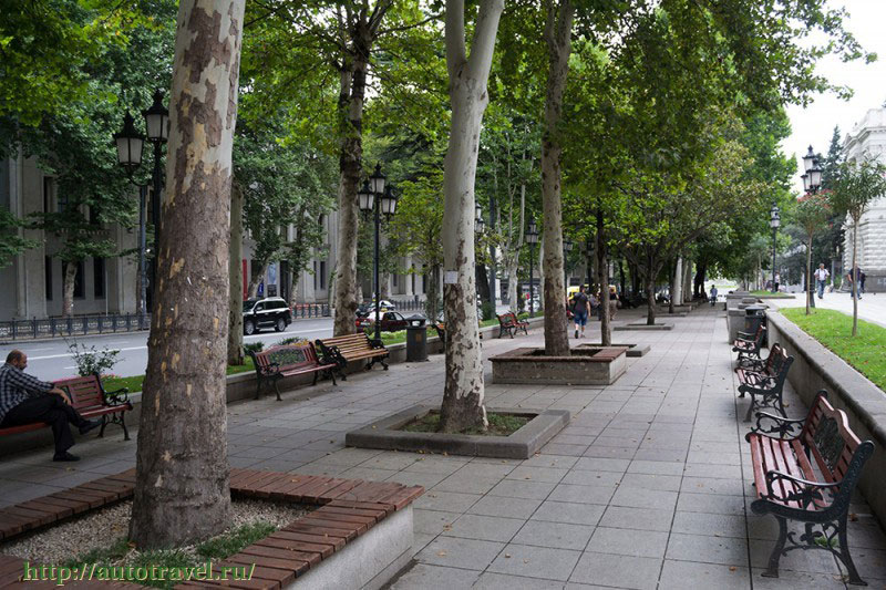 По обеим сторонам широкого и красивого проспекта Шота Руставели длиной около 1,5 км посажены тенистые платаны.