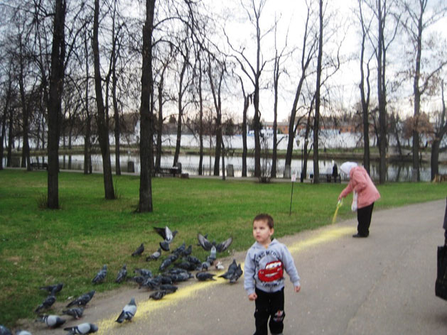 Наш правнук смотрит, как голуби клюют – насыпаное для них на краю дороги пшено.
