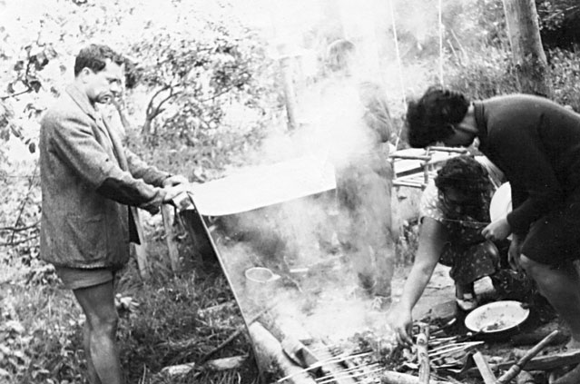 На следующий год состоялась наша первая поездка на автомобиле в Крым всей нашей тогдашней семьёй: я. Валя, Вова, Саша и дальний родственник Миша Щербаков. Для первого нашего путешествия на автомобиле мы выбрали пляж на берегу Чёрного моря в районе Саки – Евпатория. На дорогу протяжённостью 1350 километров ушло полтора дня. Установили машину, на расстоянии нескольких метров от неё – палатку, между палаткой и машиной натянули большой тент из брезента, получилось отличное продуваемое жильё как для сна и отдыха, так и для приготовления пищи. Продукты закупали на рынке, в основном дешёвые фрукты и овощи. Горячую еду: супы, второе и каши готовили на особом устройстве на основе паяльной лампы. Впечатление от такого отпуска незабываемые: постоянный шум моря, восход и заход солнца, плаванье в морских волнах, загорание на солнце. Однако, через 3 недели такая экзотическая жизнь на лоне природы, в некомфортных условиях обычно начинала утомлять. Запомнились купания с попытками забраться и сесть на надутую автомобильную камеру. Это почти никогда не удавалось, при этом камера вылетала из-под пловца, а он отлетал в кульбите в другую сторону. Особенное удовольствие от этого получали наши мальчишки.