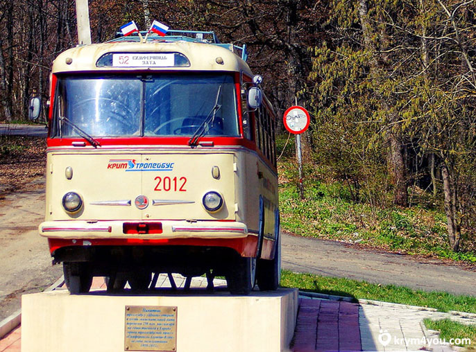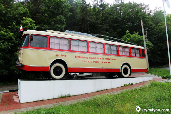 Это памятный первый троллейбус, ездивший по трассе – Семфирополь – Ялта. Его сохранили и водрузили на постамент в начале трассы.