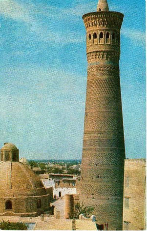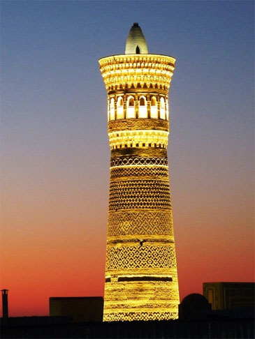 Минарет Калян – главный символ Бухары и её архитектурная доминанта. Построен из жжёного кирпича усто Бако по заказу караханидского правителя Арслан-хана. Высота – 46,5 метров, диаметр у цоколя – 9 метров. Украшен 12 декоративными поясами геометрических и эпиграфических узоров.