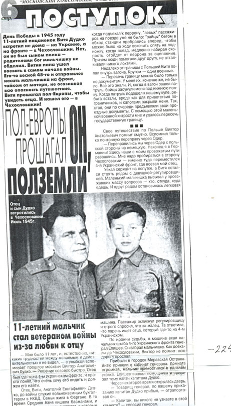 В 2005 году, узнав об этом случае, как одиннадцатилетний мальчишка убежал к отцу на фронт, была опубликована 6-го мая 2005 г статья в «Московском Комсомольце» под названием – «ПОЛ – ЕВРОПЫ ПРОШАГАЛ ОН, ПОЛЗЕМЛИ»…