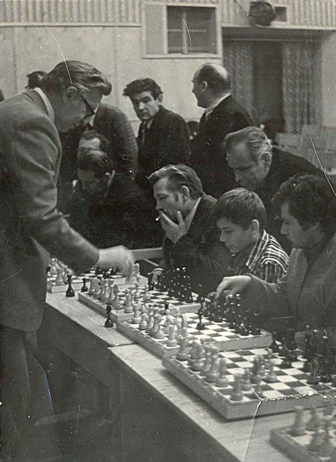 К слову сказать – Олежка занимался в шахматном кружке и владел ими не плохо. Когда моя жена – Ираида Владимировна работала начальником отдела в Госснабе, у них была организована встреча с гроссмейстером Смысловом. Он провёл сеанс одновременной игры в шахматы. В сеансе участвовал Олег. Папа Витя подсказывал ему и этим – мешал… Зато фотография на память осталась…