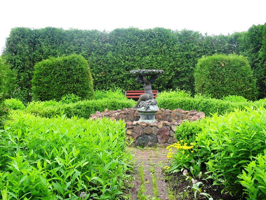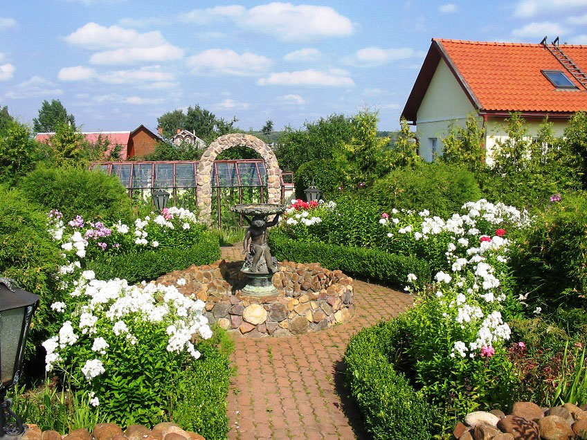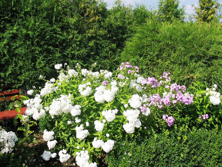 Цветущие флоксы. Стэлла провела эксперимент. Перед флоксами – посажен самшит. Она решила проверить – может ли самшит расти в подмосковье. Кусты каждый год немного подмерзали. Верхушки – подрезали. С годами стали полностью вымерзать отдельные кустики. Высоким самшит не вырос. Со временем – погиб весь.