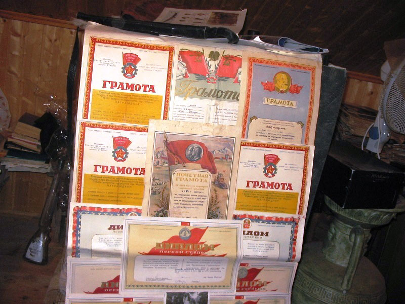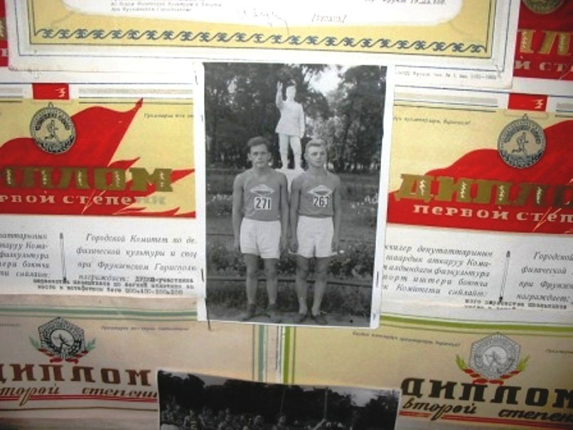 На фотографии – вырезка из полотна, сшитого из грамот, полученных Виктором за победы на различных спортивных соревнованиях во Фрунзе. Общая длина этого полотна – 2,5 метра – от потолка до пола.