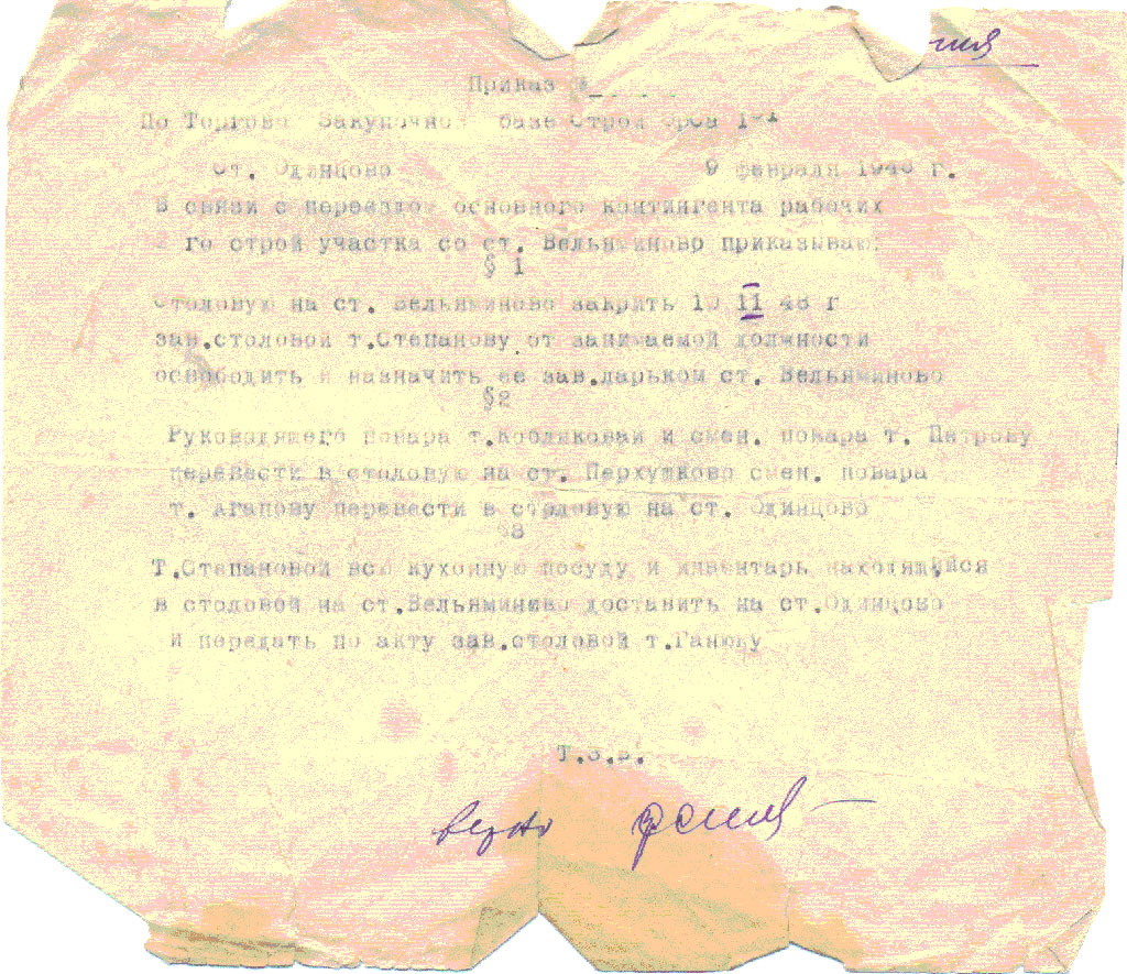 Тов Степановой всю кухонную посуду и инвентарь, находившийся в столовой на станции Вельяминово доставить на станцию Одинцово и передать по акту зав. столовой тов. Ганеку.