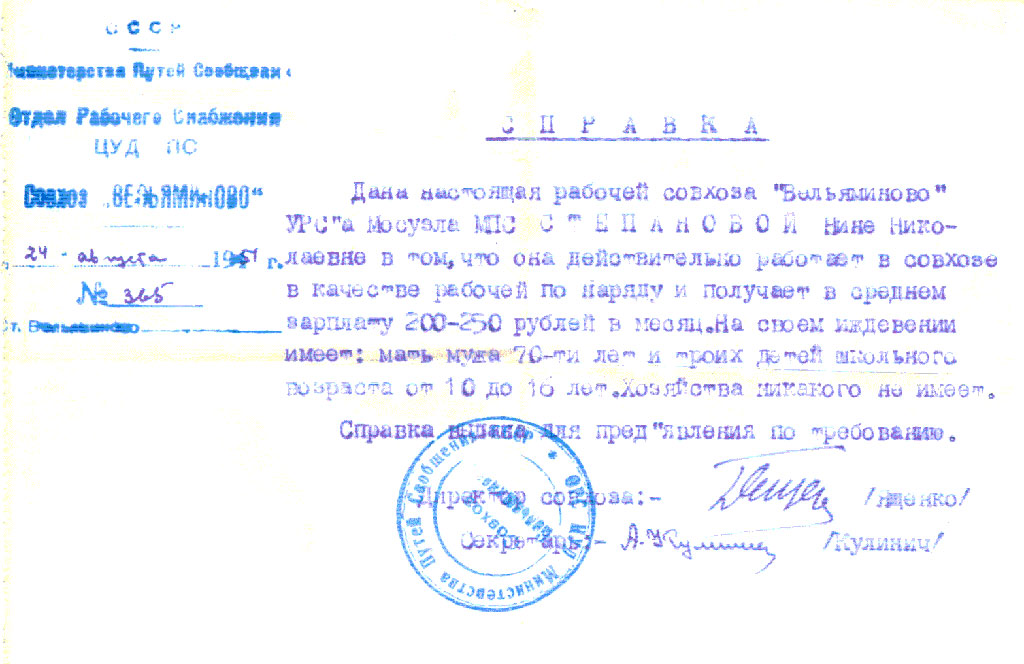 Дана настоящая рабочей совхоза «Вельяминово» УРСа МосУзла МПС Степановой Нине Николаевне в том, что она действительно работает в совхозе в качестве рабочей по наряду и порлучает в среднем зарплату 200–250 рублей в месяц. На своём иждевении имеет: мать мужа, 70-и лет, и троих детей школьного возраста от 10 до 16 лет. Хозяйства никакого не имеет.