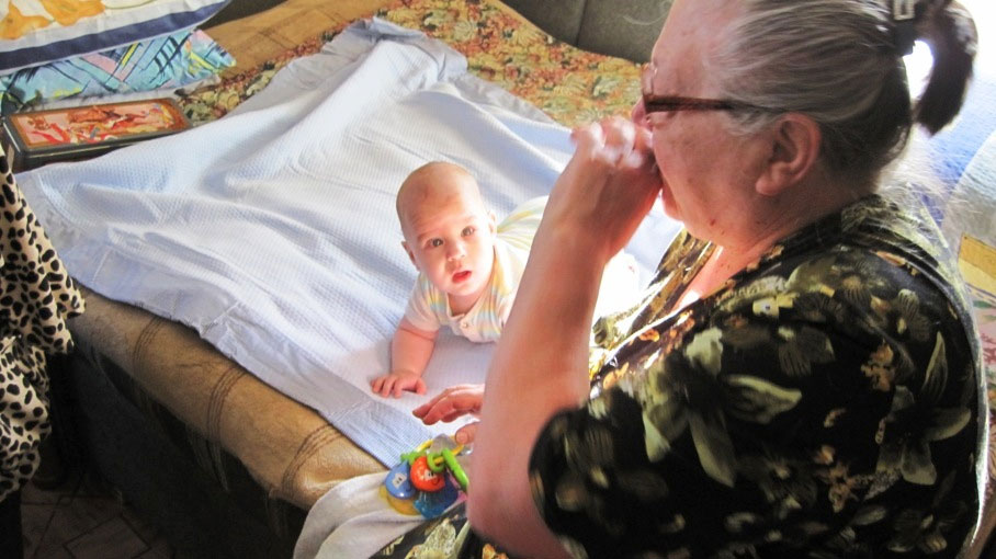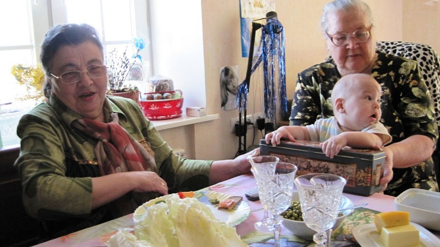 Пока мы беседуем за столом, наш правнук Илья спит на диване, загороженном стулом.