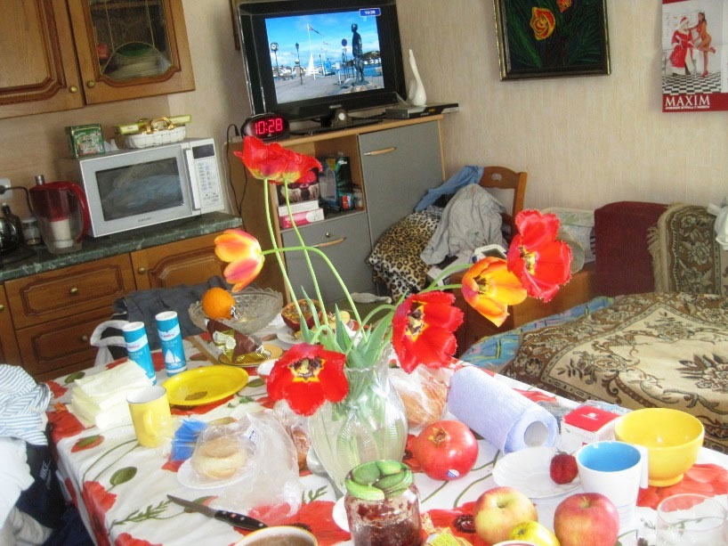 Следующая, третья стена – глухая. На высокой широкой тумбе – телевизор, который хорошо виден с наших спальных мест – и Виктору и мне. В тумбе – фотоальбомы и куча коробок с какими-то приборами (например, для стрижки) и ещё непонятно с чем.
