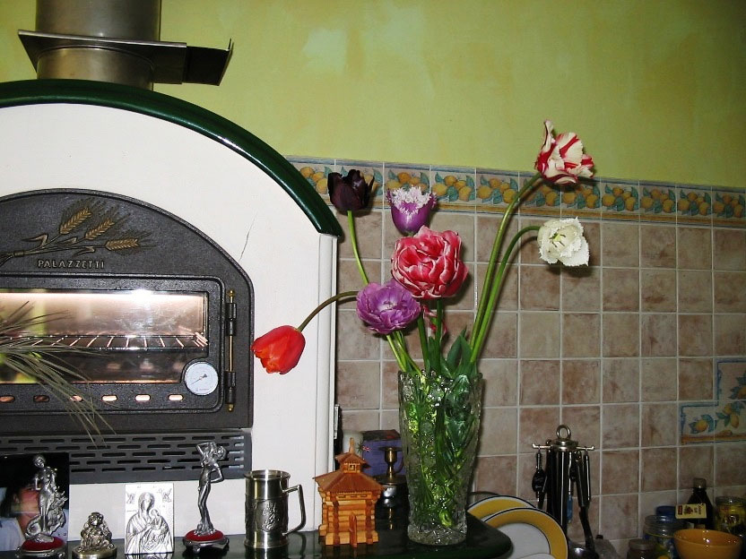 И наконец, от машинки для мытья посуды до двери, как барин в дорогом поместье – разместился большой камин. Дорогой, красивый, одетый – в изумрудного цвета итальянского производства израсцы, с духовкой в верхней части, трубой, выведенной на крышу домика и настоящей печкой внизу. Так-то мы зимой обогреваемся электроплитами. Но бывает такое – отключают свет и порой надолго. Домик остывает быстро. И тогда мы зажигаем дрова, которые всегда хранятся – заранее сложенные в печи. И глядя на игру языков пламени, исполняющих дикие мистические пляски в темноте ночной комнаты, мы уносимся мыслями в другие миры и не можем оторвать взгляд от этого колдовского зрелища.