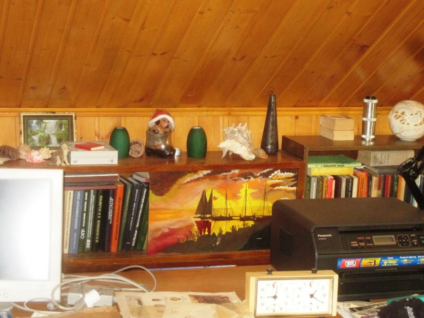 Одно время я увлекалась живописью. Рисовала в основном картины на чём попало, только не на бумаге. В основном – на фанере и даже на стекле. Поэтому на стёклах многих книжных полок сохранились мои рисунки типа той, которая – на этом снимке.