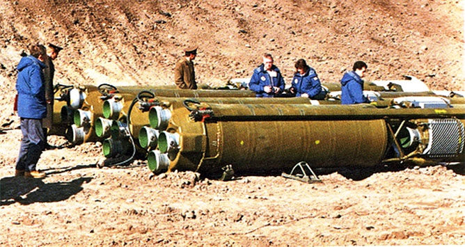 Двигатели 1-й ступени ракет 9М76 комплексов «Темп-С» перед уничтожением в Сары-Озеке, 1989 г. (http://flickr.com).