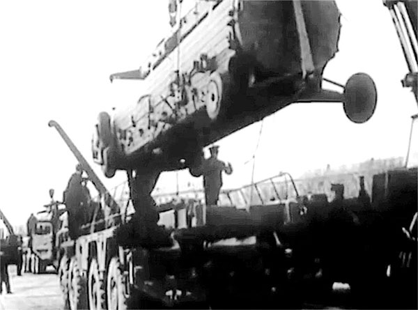 Снятие крышки контейнера 9Я230 с СПУ 9П120 (кадр из документального фильма "Автомобили в погонах", ТРК ВС РФ «Звезда», 2009 г.)
