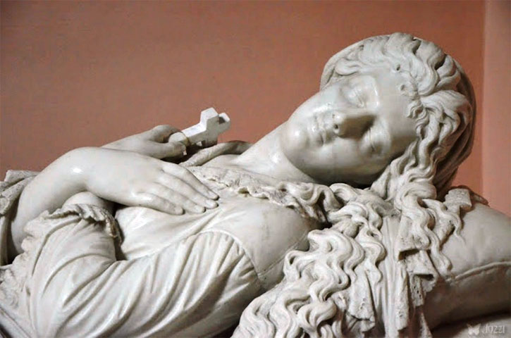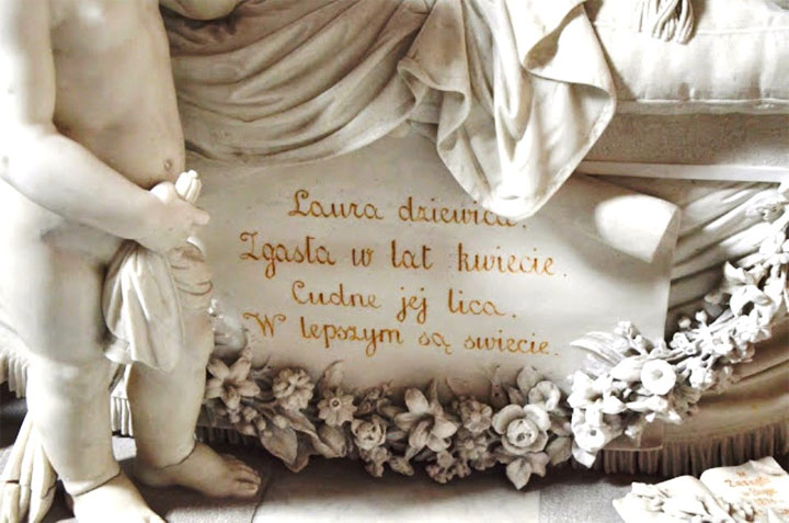 В часовне Непорочного зачатия Петропавловского кафедрального костёла установлена скульптура из белого каррарского мрамора. На ложе лежит прекрасная дева, с разметавшимися по подушке волосами. Перед скульптурой можно стоять часами, заворожено смотря на это чудо. Кажется – она живая. А покрывало, накинутое на половину её тела, будто прозрачно – так робко, но явно, оно обрисовывает все изгибы её тела. Кажется – она спит. Но руки скрещены на груди, и рядом в руках маленького ангелочка – потухший факел. Да, она спит, но спит вечным сном. Рядом установлены бюсты мужчины и женщины. Один из них – бюст отца Лауры. Второй – то ли самой Лауры, то ли её сестры Марии. Внизу – упавшая книга, раскрытая на 21 странице.