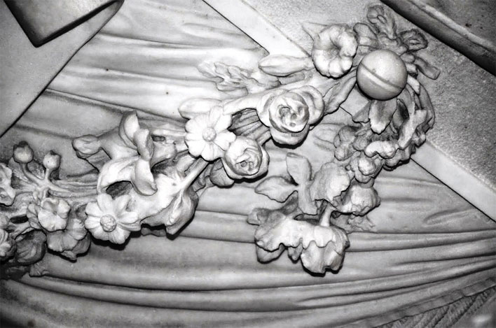 Вдоль ниспадающего с ложа покрывала развёрнут свиток со словами «Девица Лаура, Угасла в цвете лет, Прекрасное её лицо, В лучшем сейчас свете».