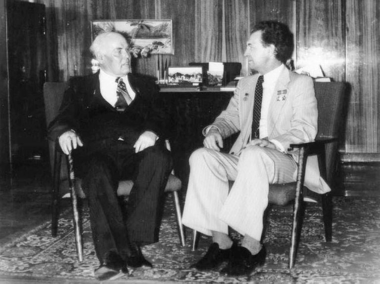Я. Ф. Савченко увлеченно рассказывает летчику-космонавту СССР В. И. Севастьянову о планах создания в будущем «Клубе аргонавтов» кружков научного и технического творчества детей.