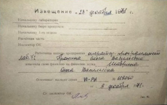 Замужество и изменение фамилий вносились в таблицу регулярно, так как на эту сотрудницу в лабораторию приходило обязательно извещение из отдела кадров…