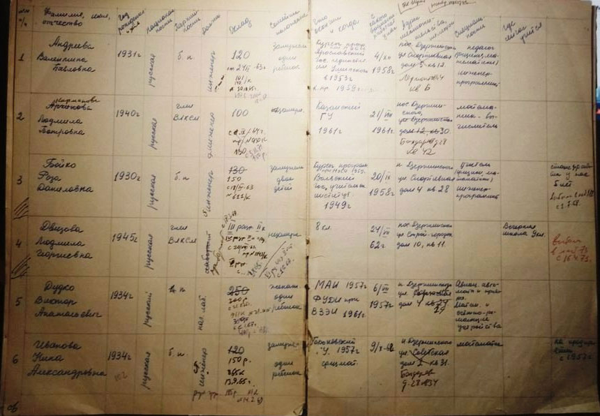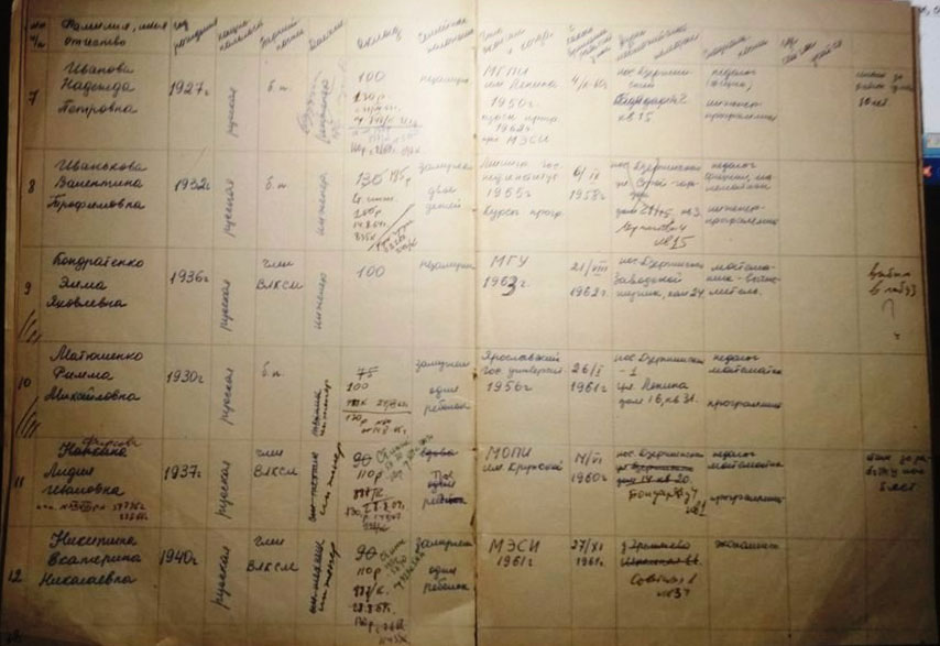 1930 г. р., русская, б/п, техник, инженер, 75 р.,100 р. с 24.06. 1963 г., 130 с 14.05. 1965 г., замужем, один ребёнок, Ярославский Государственный университет в 1956 г., в лаб. С 1961 г., педагог – математик, программист.