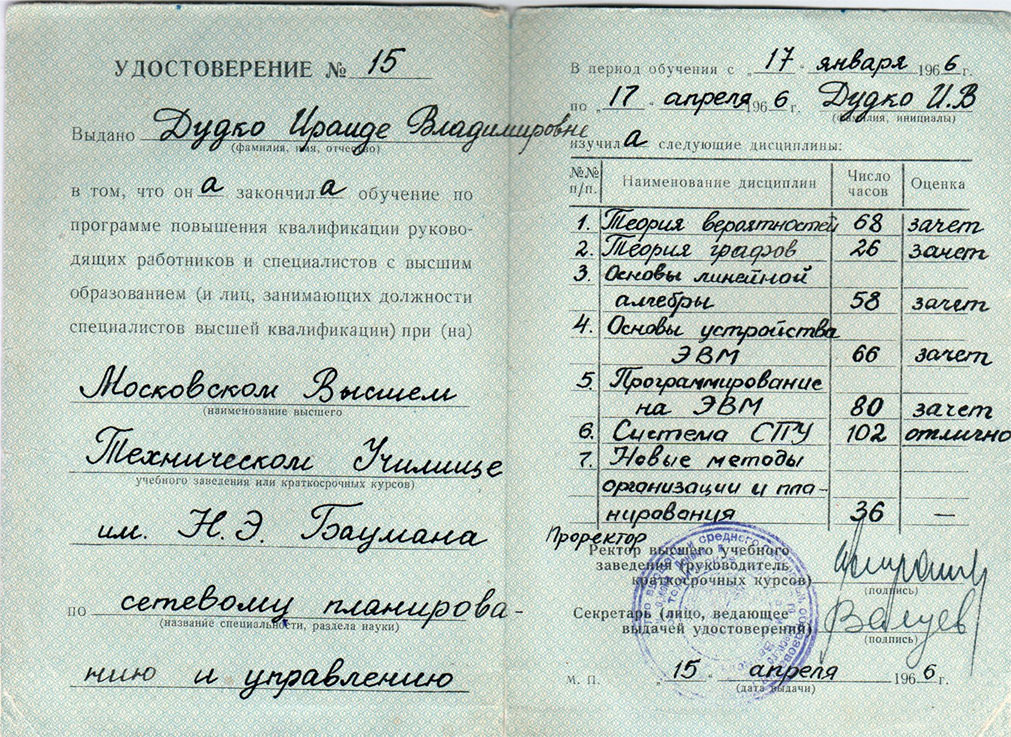 С высшим образованием (и лиц, занимающих должности специалистов высшей квалификации при Московском Высшем Техническом Училище им. Н. Э. Баумана по – сетевому планированию и управлению.