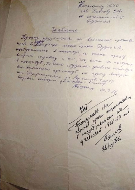 Дудко В. А. 22.07.1966 г.На заявлении стоит резолюция нач. ЖКО ПАВЛОВА: