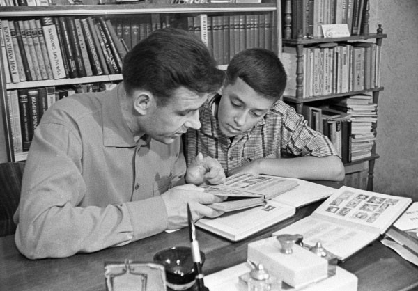 Комаров с сыном Космонавт Владимир Комаров с сыном Евгением рассматривают марки.