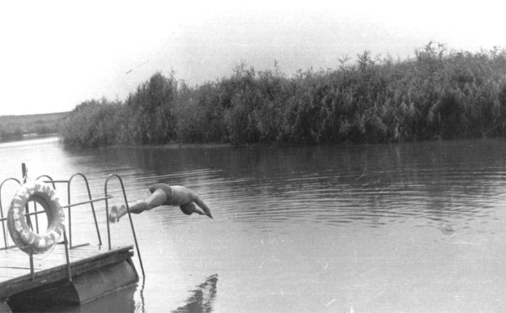 Олег ныряет с причала в речку, на берегу которой расположилась заводская база отдыха.