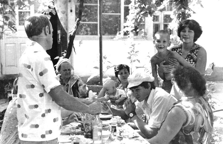 На фотографии – слева: стоит старший сын Равиль, дальше – тётя Нина, затем Светочка с сыном (жена Ганика), Стэлла, Олег и мама (Ираида).