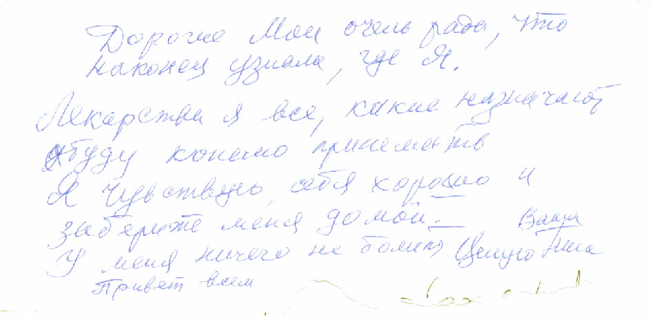Нас в реанимацию не пускали. Взяли лишь записку, в которой мы старались маму успокоить и уговаривали – не волноваться и полечиться. Мама прислала в ответ записку, которая у меня сохранилась.