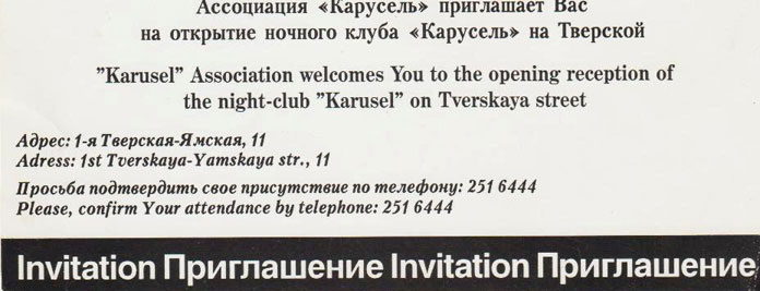 У нас сохранился пригласительный билет на открытие ночного клуба «Карусель».