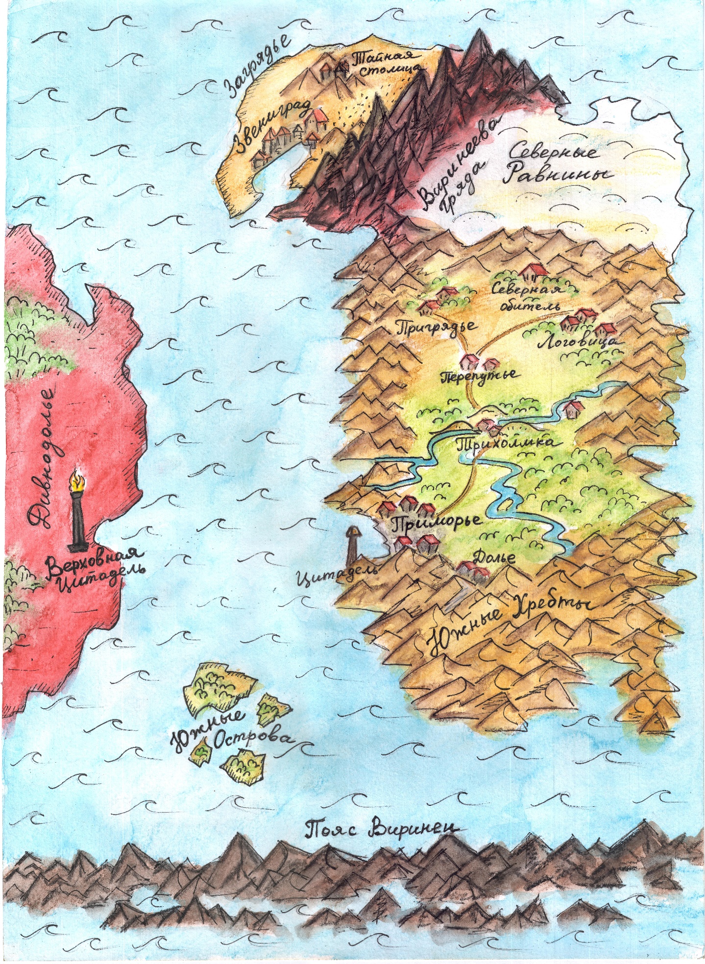 Зара и страшилась, и ждала появления мужа. Страшилась его горячности и в то же время хотела расспросить о синих людях на змеях, о море. Какой, оказывается, мир большой. Она знала, что властво их называют Кольцегорьем, да сами горы только раз видела, когда отец возил их с матушкой в Перепутье. Он указал на синюю дымку по горизонту, пояснил, что это горы, а за ними – столица, Приморье. Ещё сказал, что на юге Кольцегорье граничит с Южными Хребтами, влаством злобного брата Грома. На севере – Северные Равнины, где родился Зазимок. Где-то на побережье – страшная Виринеева гряда. А на западе, за морем – Дивнодолье, посреди которого выше облаков поднималась Верховная Цитадель.