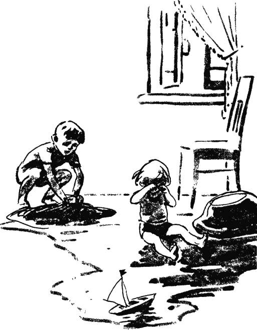 Женя испугался, растерялся. Сунул куда-то лодку, сбегал за тряпкой. Окунул её в лужу; она тотчас намокла, а лужа не стала меньше. Женя бросил тряпку и кинулся вытаскивать Саню из лужи. Вытащил, посадил на стул, а дальше не знал, что и делать.