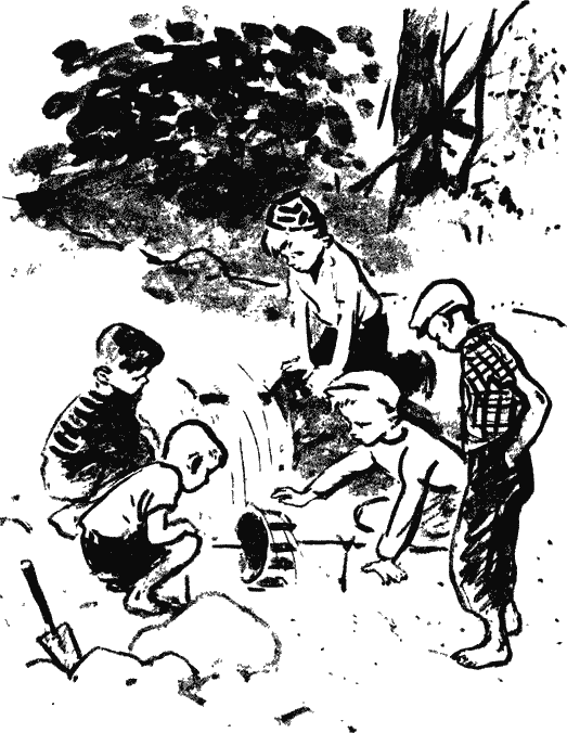 Как раз под струёй мальчики вбили две рогульки и положили на них сверкающее колесо.