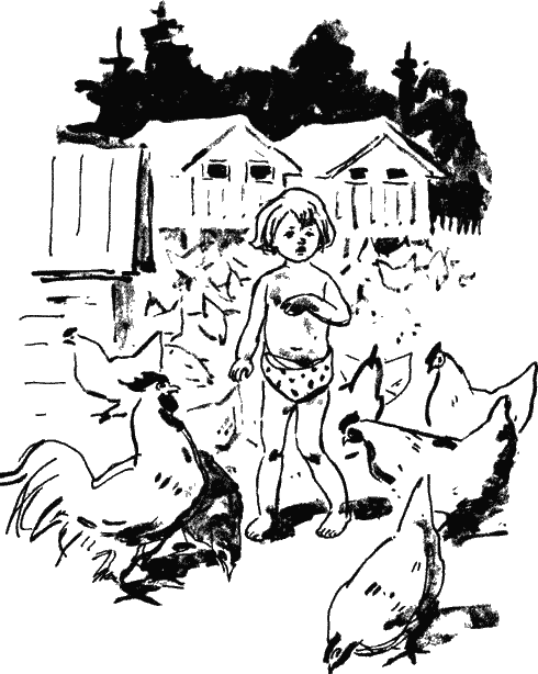 Вот она вышла к одному домику. На площадке стояла поилка, полная чистой воды. Куры пили воду, высоко закидывая головы.