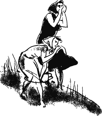 Потом ей повстречались две белые курицы: они сидели прижавшись к земле. Дальше ещё одна курица что-то клевала.