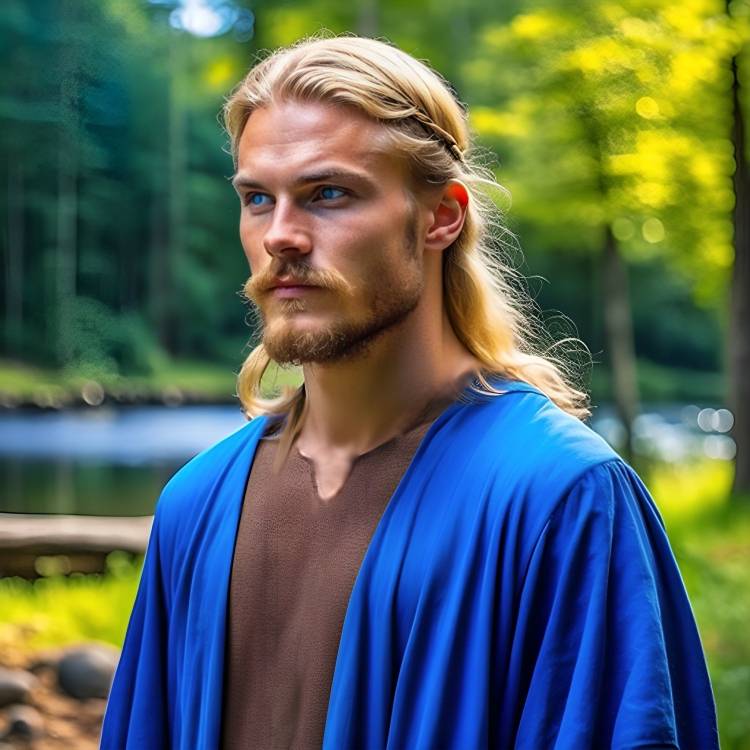 Он молод, хоть уже и не юн. Велик ростом и статен. Лоб гладкий и высокий, а под русыми бровями лучатся глаза чистейшего голубого цвета. Длинные светлые волосы, перехваченные на лбу узким кожаным ремешком, спадают волнами на широкие плечи. Недлинная русая бородка обрамляет подбородок. Голубая рубаха, по вороту отделанная алыми шелковыми лентами и вышивкой, стянута кожаным поясом с серебряными накладками. Темно-коричневые штаны из тонкой шерсти облегают сильные ноги. На боку – затейливо украшенные ножны с мечом, рукоять которого сияет позолотой. На обеих руках витые серебряные браслеты.