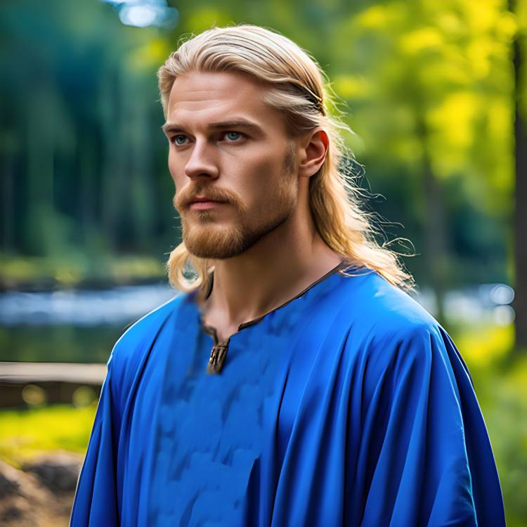 Он молод, хоть уже и не юн. Рослый и великолепно сложенный. Лоб гладкий, высокий, а под русыми бровями лучатся глаза чистейшего голубого цвета. Длинные светлые волосы, перехваченные на лбу узким кожаным ремешком, спадают волнами на широкие плечи. Недлинная русая бородка обрамляет подбородок. Широкие плечи, мощный торс, узкие бёдра, прямые сильные ноги. На груди плетёный кожаный шнурок с серебряным амулетом. Кажется, он называется молотом Тора. На обоих запястьях мужчины витые серебряные браслеты. А на левом предплечье – тату в виде свернувшейся кольцом змейки с цепочкой рун на спинке.