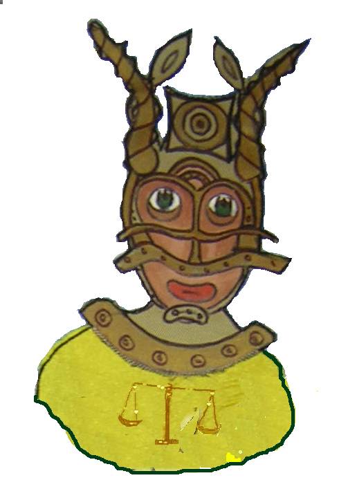 Ксант Терций – его рогатую маску украшал знак вселенной, квадрат с кругами внутри. Он изучал свойства космического мира, мог не только увидеть, но и потрогать космическое вежество. Он ведал строительством и благоустройством планеты Необиру. Вышитые золотыми нитками весы на его желтом плаще означали, что все в этом мире можно взвесить и оценить. Девизом Ксанта было: «беспристрастность и справедливость».