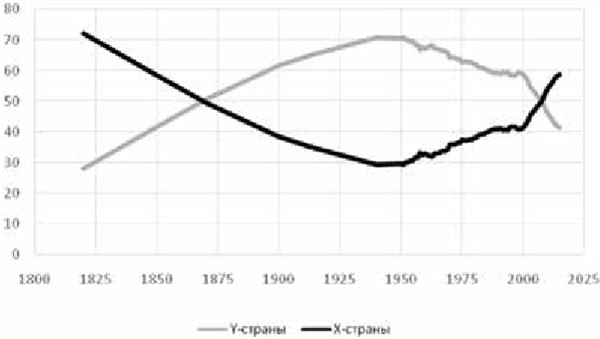 Рисунок 9. Соотношение развития стран, относящихся к матрице Х и Y, в суммарных долях ВВП в % за период с 1820 по 2015 гг.[14]