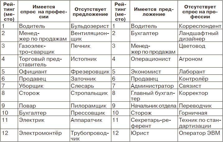 В таблице 1 проранжированы 25 позиций спроса и предложения профессий. По 10 позициям из 25, представленных в рейтинге, спрос и предложение примерно одинаковы. Это свидетельствует о наличии структурной безработицы, вероятностная причина которой в недостаточной квалификации работников.