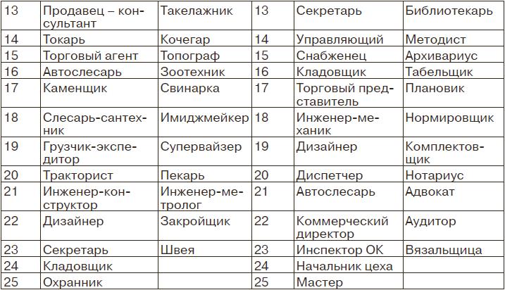 Дешифратор категорий профессийМладший обслуживающий персонал: продавец, уборщик, сторож, подсобный рабочий, грузчик, курьер, экспедитор, вахтёр, официант, бармен, кассир, секретарь-делопроизводитель, лаборант, диспетчер, статистик, горничная, санитарка, приёмщик, контролёр, упаковщик, сортировщик, кондуктор и т. д.