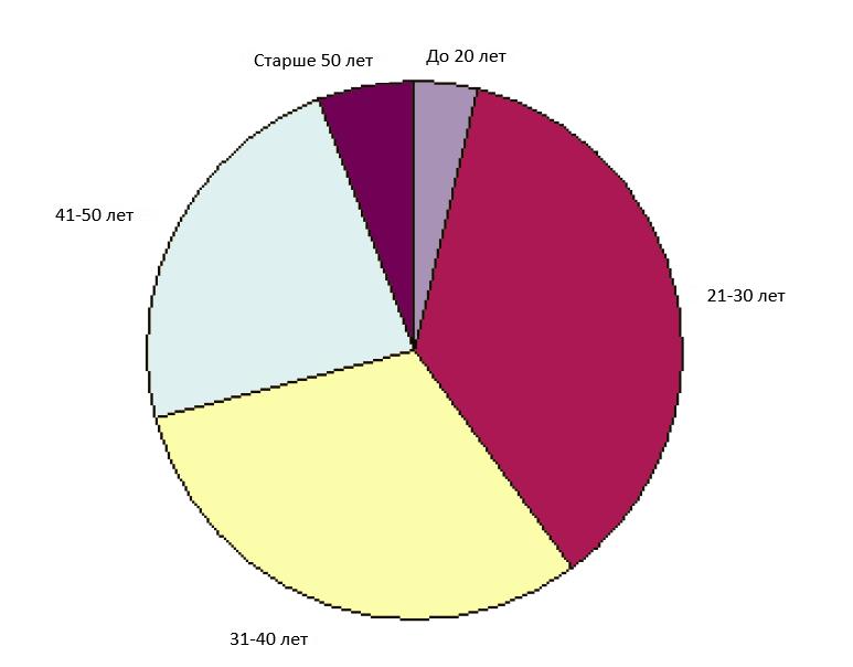 В целом по выборке существенных расхождений между мужчинами и женщинами по представленным возрастным категориям не выявлено. Наибольший процент (35,7 %) граждан, занятых поиском работы, приходится на возрастной период от 21 года до 30 лет. Треть соискателей находятся в наиболее работоспособном возрасте – от 31 года до 40 лет.