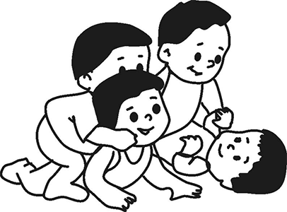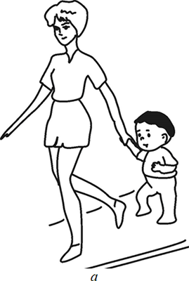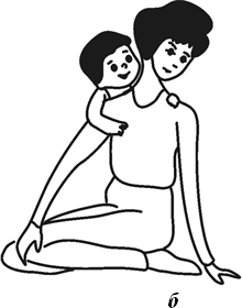 Хороши совместные передвижения по комнате – стайкой или гуськом – взрослый чуть впереди (он лидер), дети держат друг друга за плечи или за бедра (паровозик). Контакт рук ориентируется не столько на пальцы, сколько на запястье руки, поэтому работая с ребенком, удерживаем его за запястья, сжимаем глубоко до косточек (рис. 2.6, а). Обычно дети всегда с радостью идут на взаимоконтактные игры (рис. 2.6, б и в).