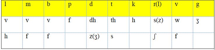 Мы полагаем, приведенные чередования являются частью системы, которую можно выразить через универсальную формулу: m > p(b) > k(g) > h > s >sh > ʧ.