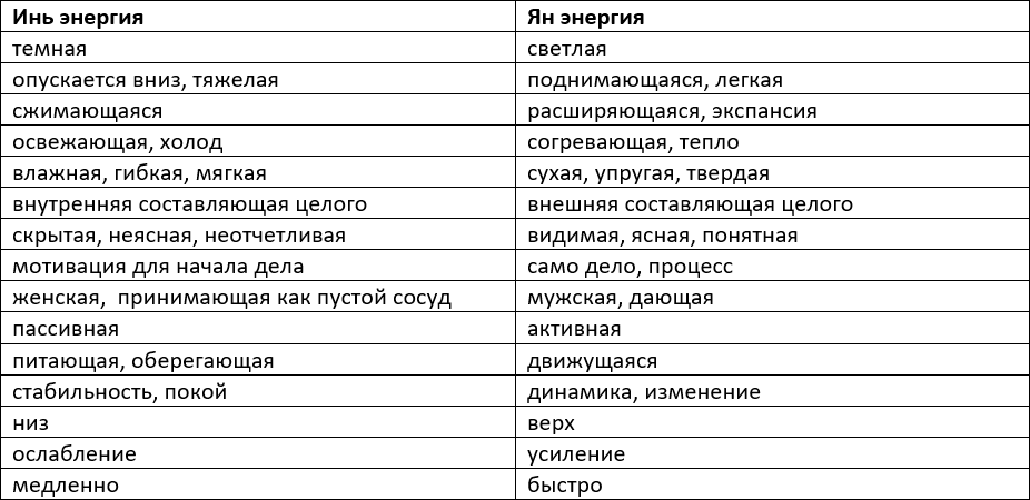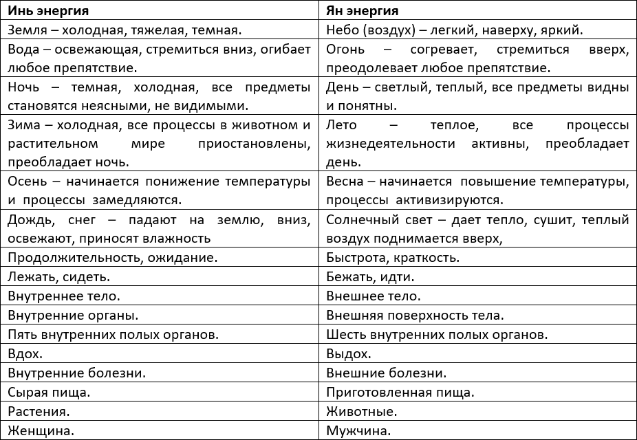 Каждому предмету с качеством Инь обязательно есть пара с качеством Ян. И ничто не является только Инь или только Ян: все состоит в некотором соотношении одного и другого. В чем-то преобладает Инь, в чем-то Ян. Примеры в таблице № 2:
